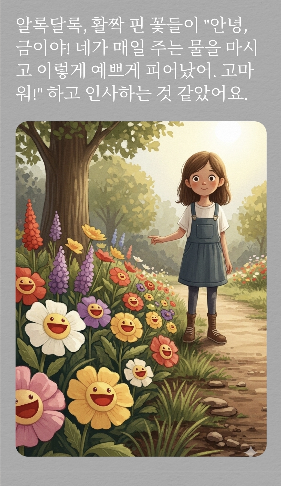 아이가 '예쁜 꽃이 피어났다'고 대답하며, 단점이라고 생각했던 것이 좋은 결과를 가져올 수 있다는 것을 자연스럽게 이해하게 될 거예요.